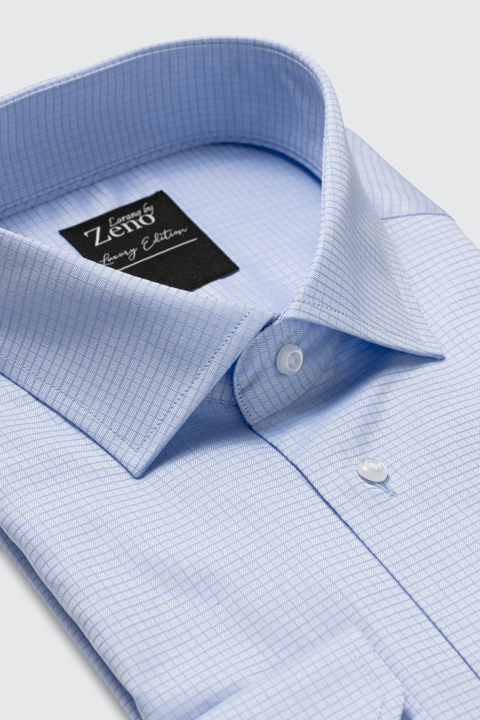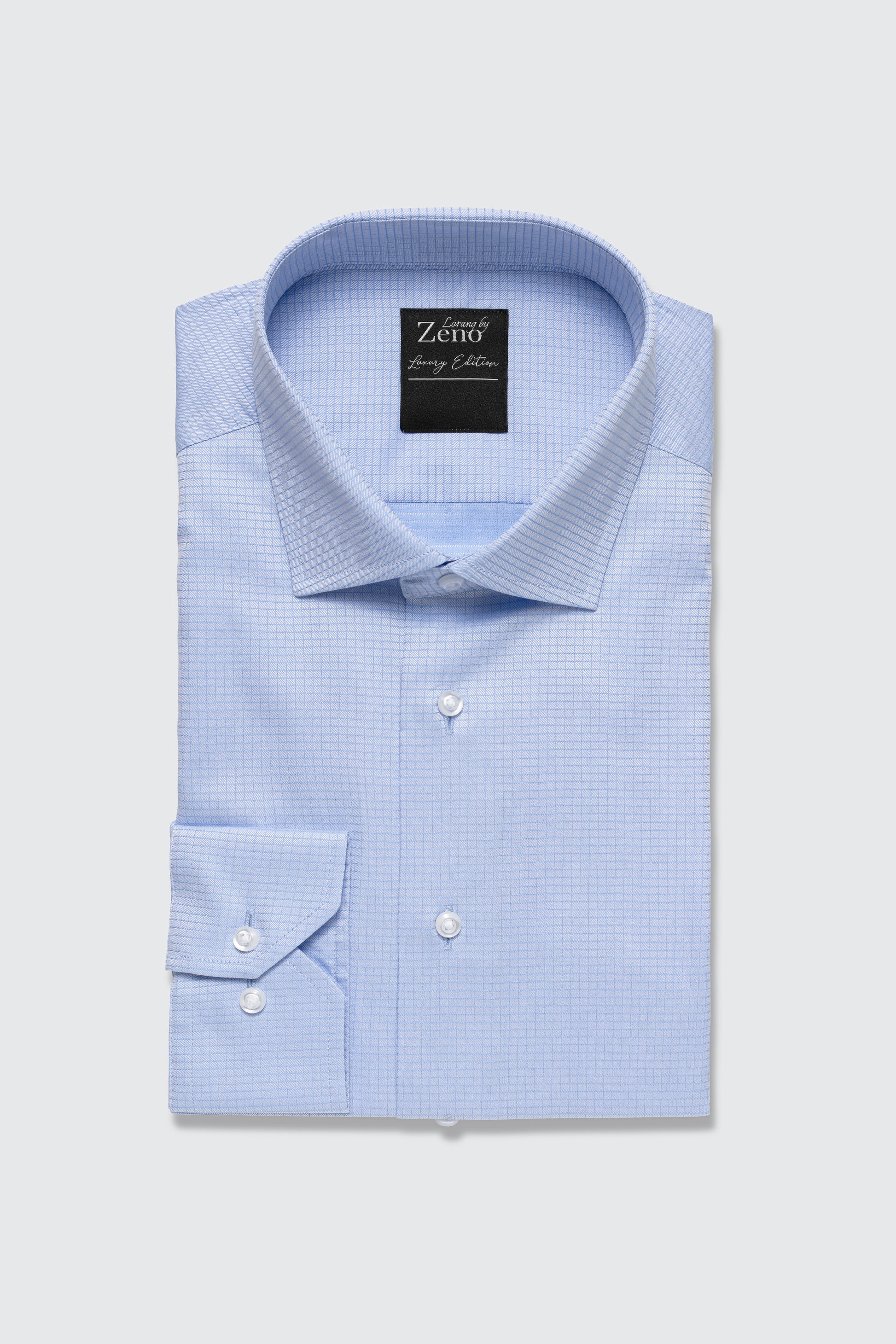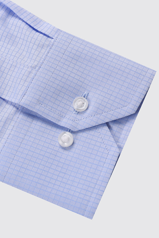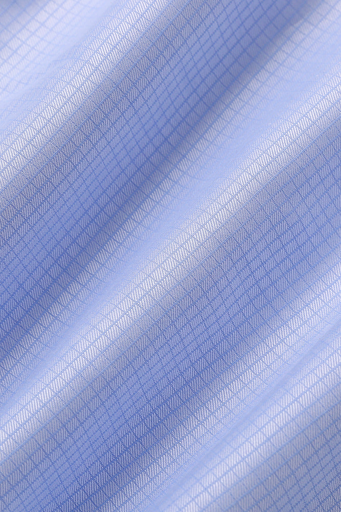 Skjorte i 100% 2ply bomull. Klassisk lyseblå med delikate innvevde ruter ton i ton. .En tidløs skjorte, designet med tanke på business. Regular fit for en rettere passform. Knapper i perlemorsfarge og cut away krage. Skjorten er lettstelt og trenger minimalt med pleie etter ordinær vask og tørk. Blend: 100% 2ply bomull