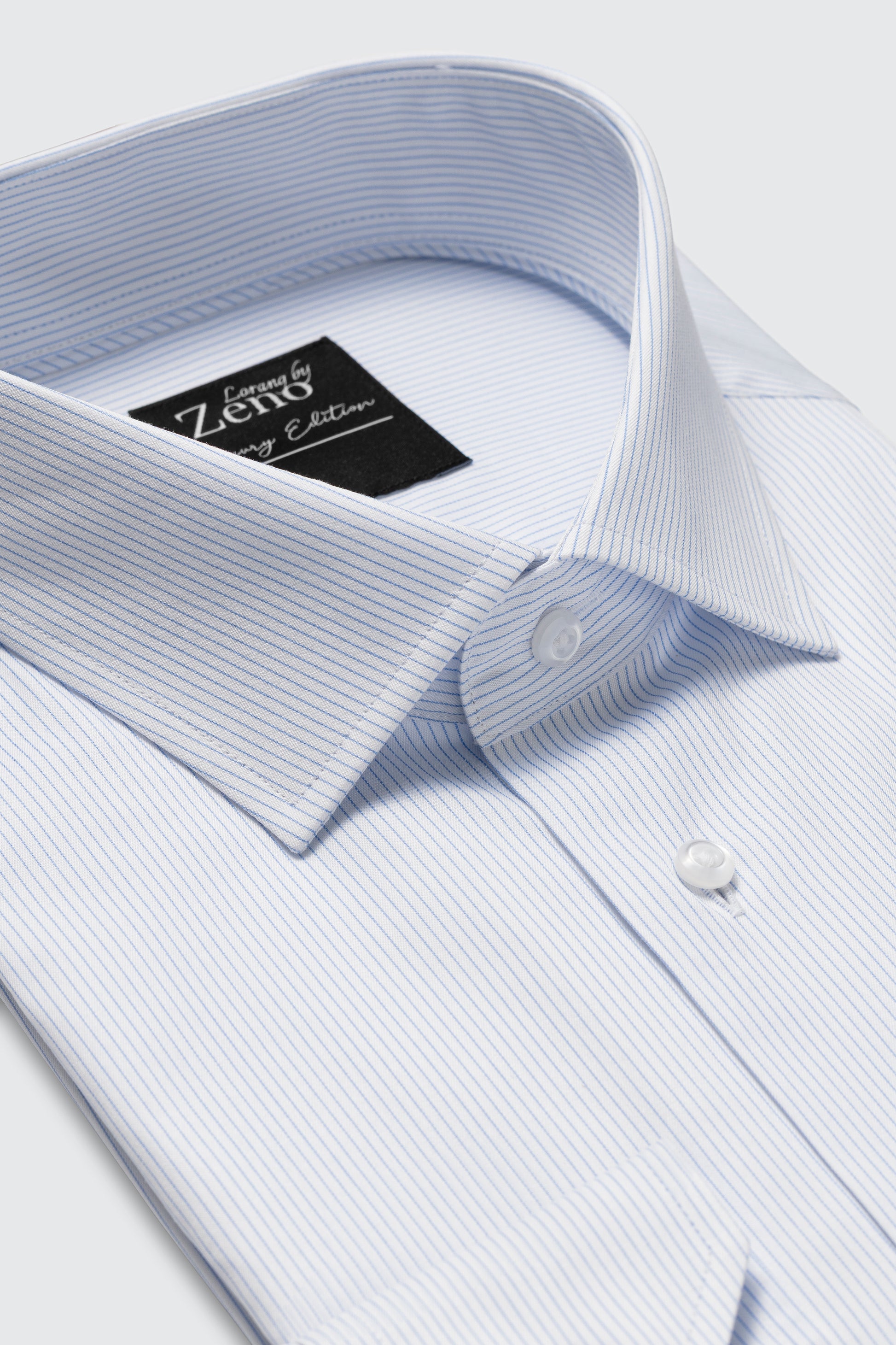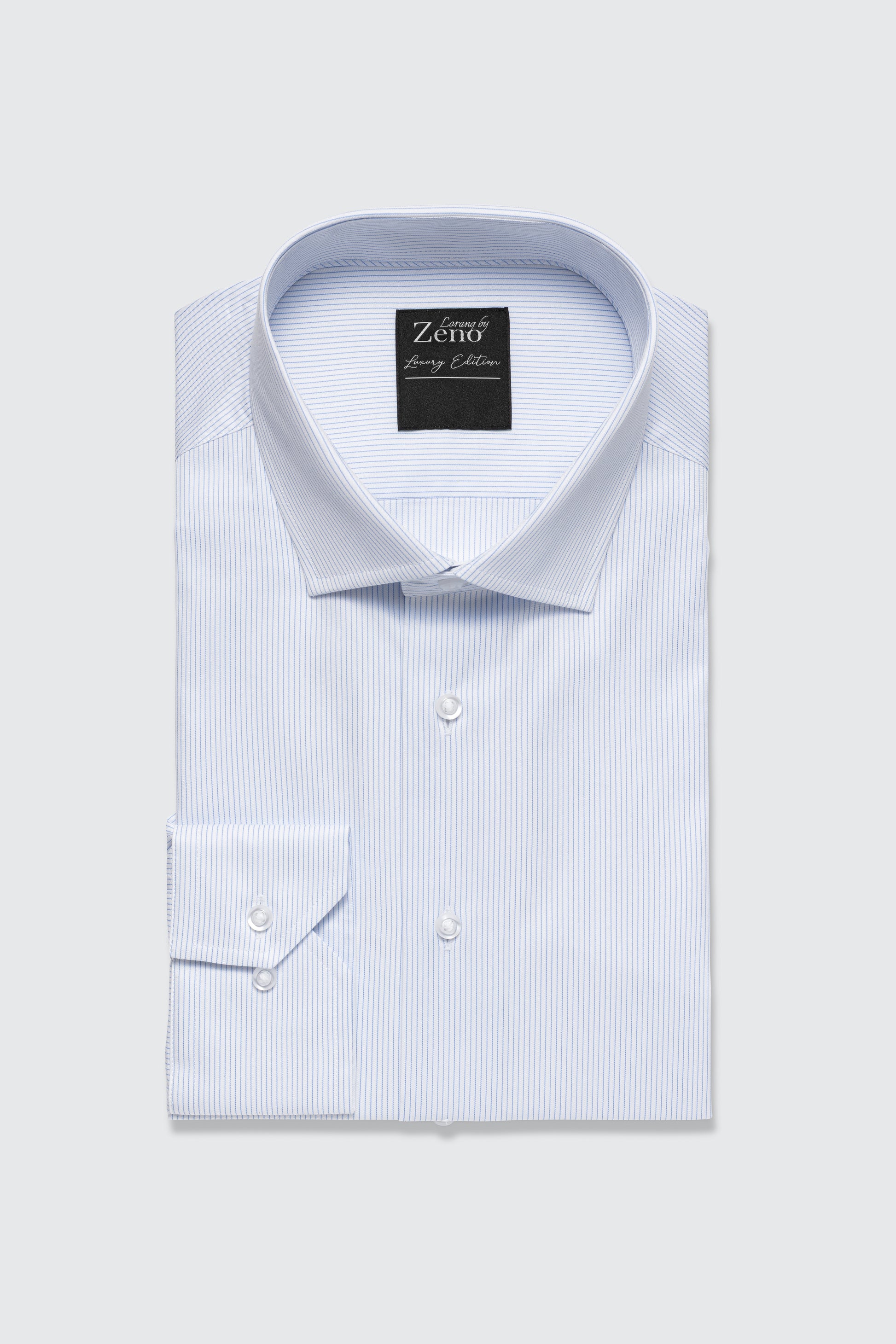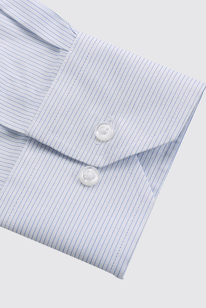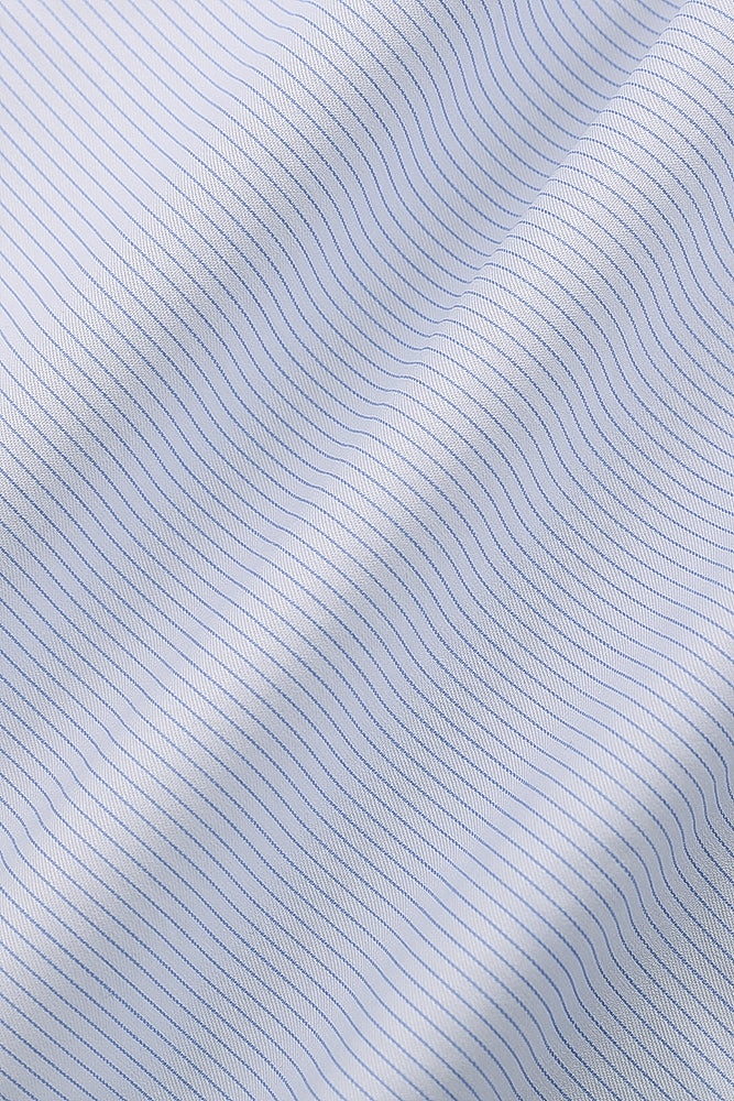 Lys blå skjorte i 100% 2ply bomull. Delikate striper for business og andre velkledte anledninger. En klassisk skjorte som er sydd i slim fit for en smalere passform. Perlemorsfargede knapper og cut away krage. Skjorten er lettstelt med lite behov for pleie etter vask og tørk. Blend: 100% 2ply bomull