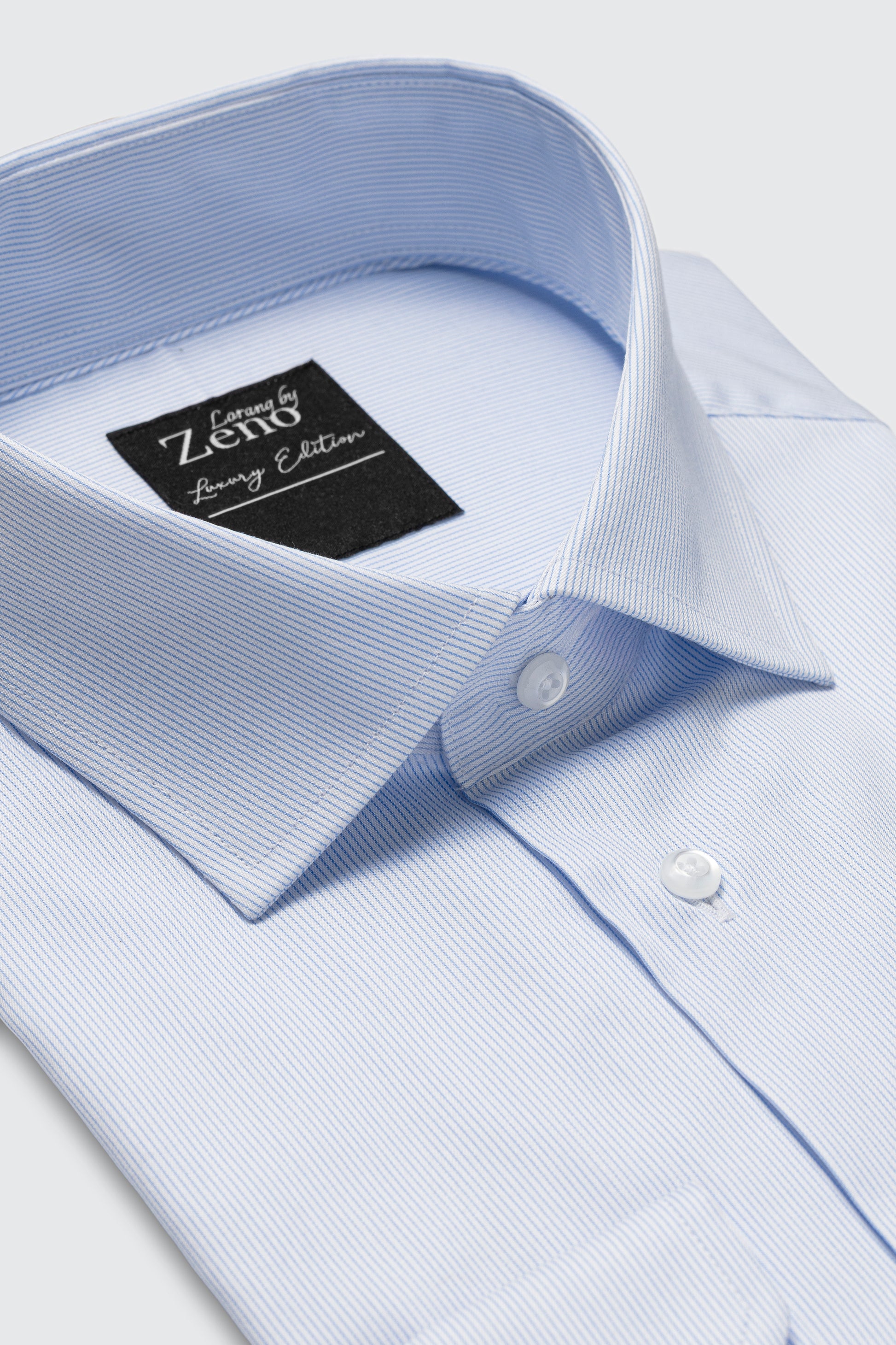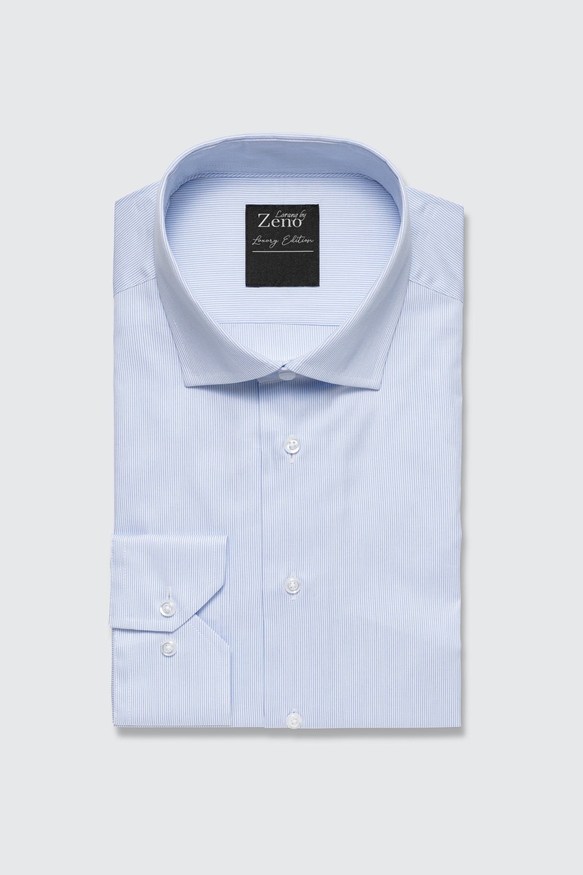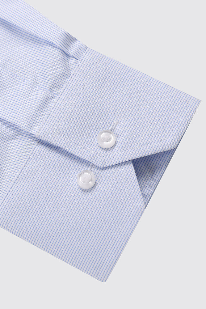 Lyseblå skjorte i 100% 2ply bomull. Smale, elegante striper i veven - skreddersydd business og velkledte anledninger. En klassisk skjorte, i regular fit for en rettere passform. Perlemorsfargede knapper og cut away krage. Skjorten er lettstelt med lite behov for pleie etter vask og tørk. Blend: 100% 2ply bomull