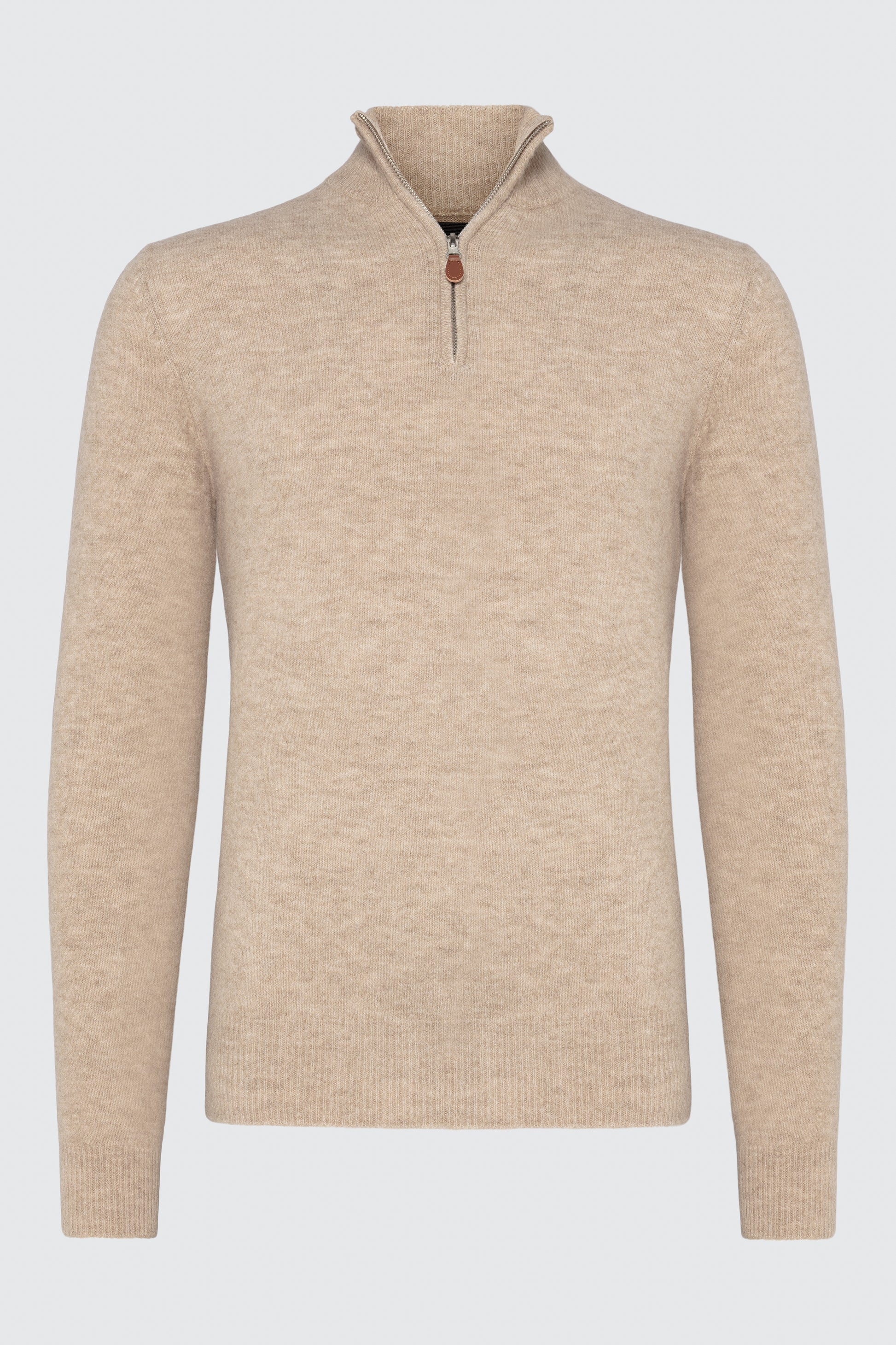 Lun genser i delikat sandfarge. Utformet med halfzip og strikket i en myk kasjmirblanding. Passer perfekt over skjorten. Normal i størrelsen, velg din vanlige størrelse. Blend: 21% kasjmir, 13% viskose, 15% antinuppende akrylull, 20% nylon, 30% polyester.