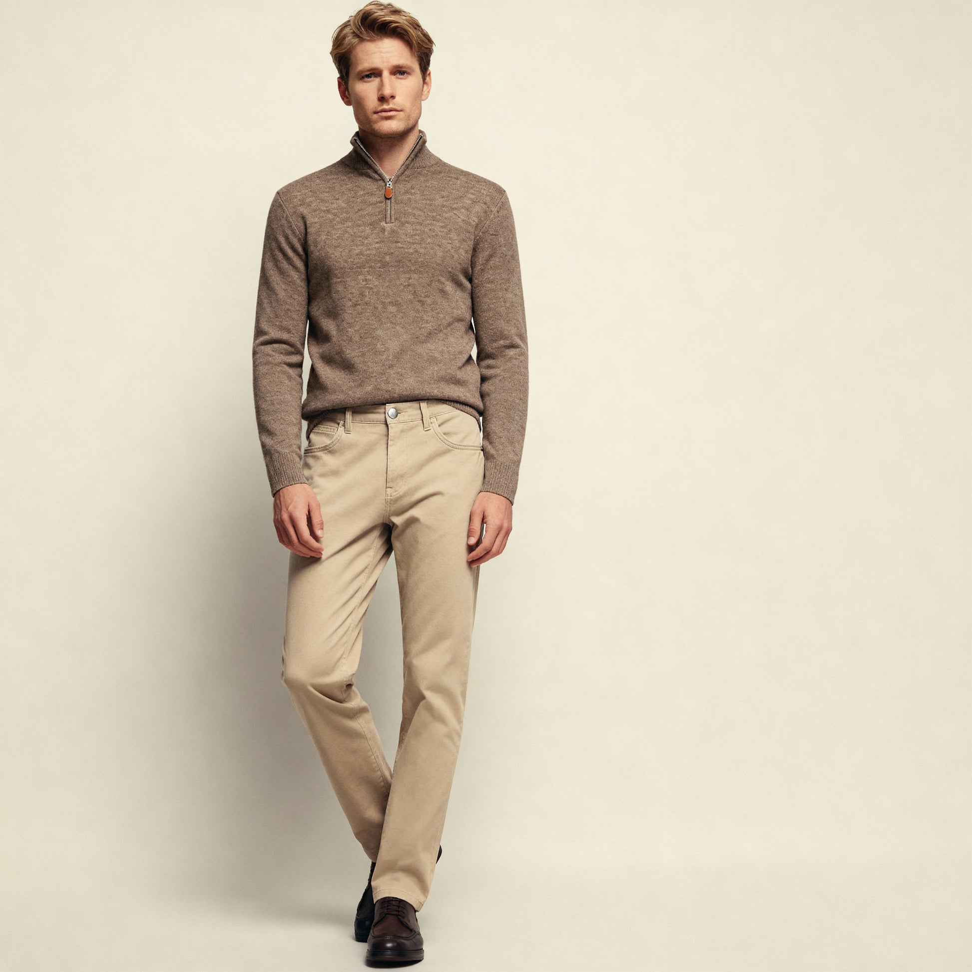 Tidløs genser i hasselnøttbrun. Utformet med halfzip og strikket i en myk kasjmirblanding. Passer perfekt over skjorten. Normal i størrelsen, velg din vanlige størrelse. Blend: 21% kasjmir, 13% viskose, 15% antinuppende akrylull, 20% nylon, 30% polyester.