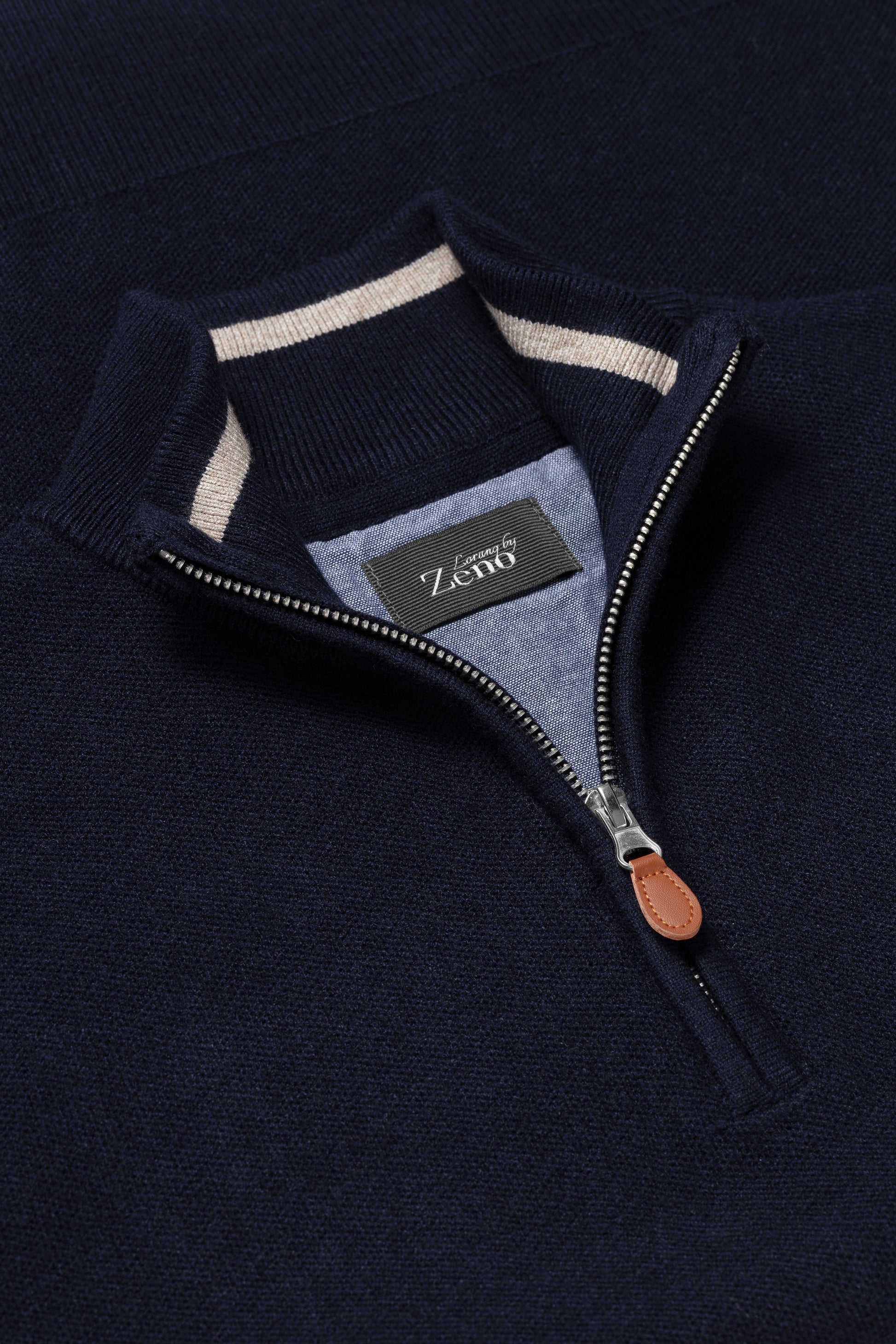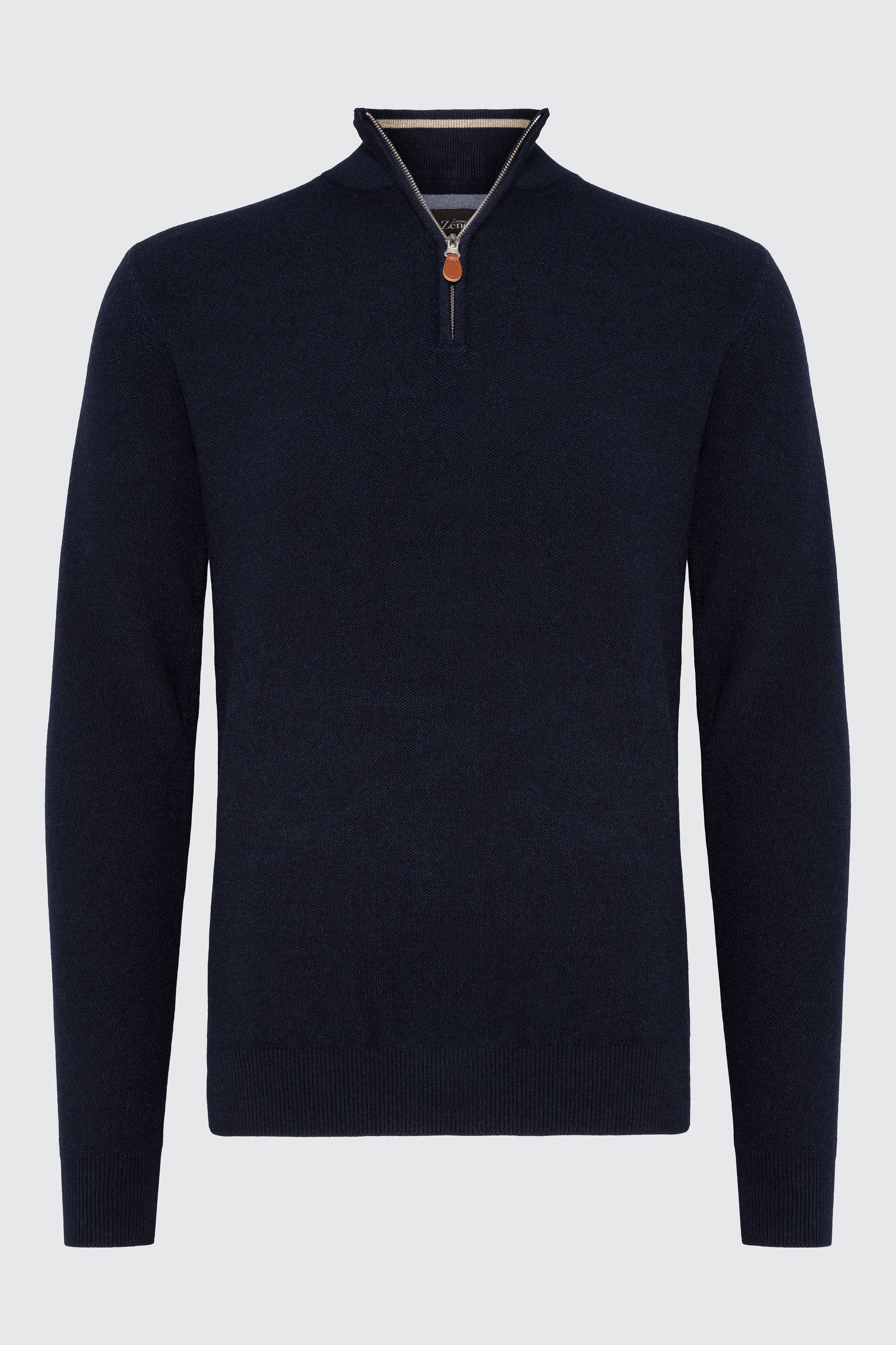 Klassisk marineblå strikket genser med lett struktur og half zip krage. Designet for å passe perfekt over skjorten. Normal i størrelsen, velg din vanlige størrelse. Blend: 51% viskose, 20% bomull, 8% polyester, 21% nylon.