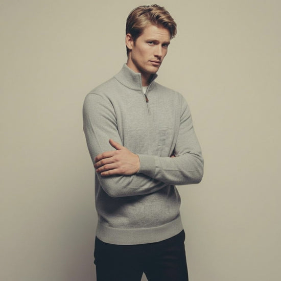 Tidløs grå strikket genser med lett struktur og half zip krage. Designet for å passe perfekt over skjorten. Normal i størrelsen, velg din vanlige størrelse. Blend: 51% viskose, 20% bomull, 8% polyester, 21% nylon.
